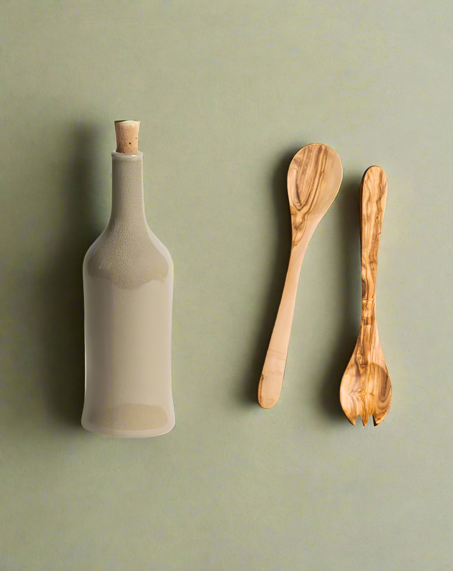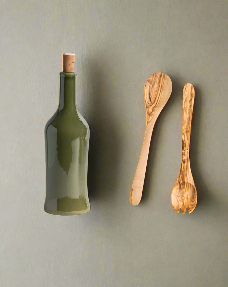 Experience the perfect harmony of nature and craftsmanship with the Olive Essence Duo. This elegant bundle features a handcrafted olive wood salad server set and a stoneware bottle, ideal for serving your finest oils or vinegars. Designed to bring a touch of Mediterranean charm to your dining table, this duo is perfect for elevating both everyday meals and special occasions.