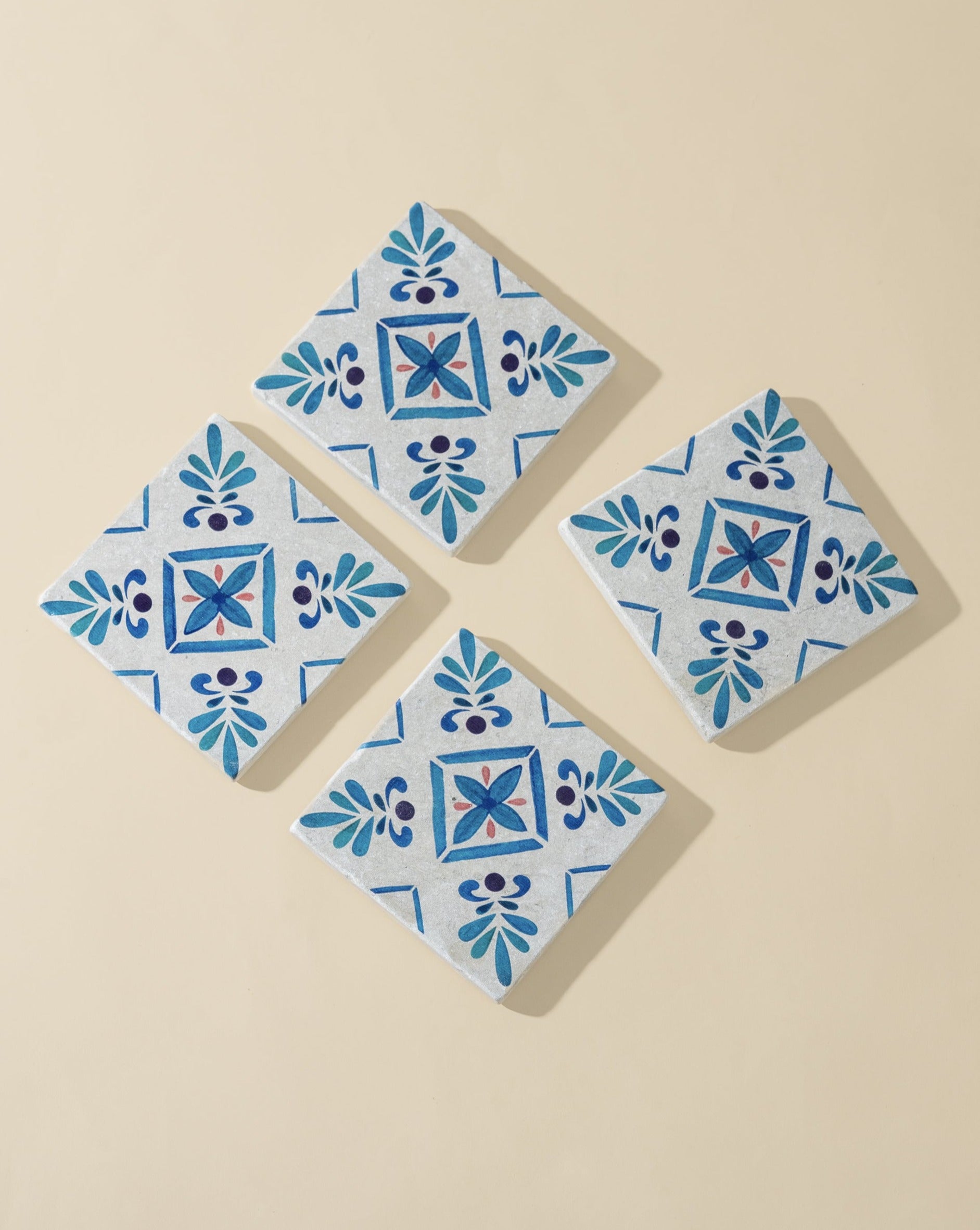 Add a hint of vintage sophistication to your table settings with Clayora's exquisite Malaga Collection of hand-finished tumbled marble tiles coasters. Adorned with delicate white and blue patterns, these coasters seamlessly blend aesthetic charm with dependable surface protection.